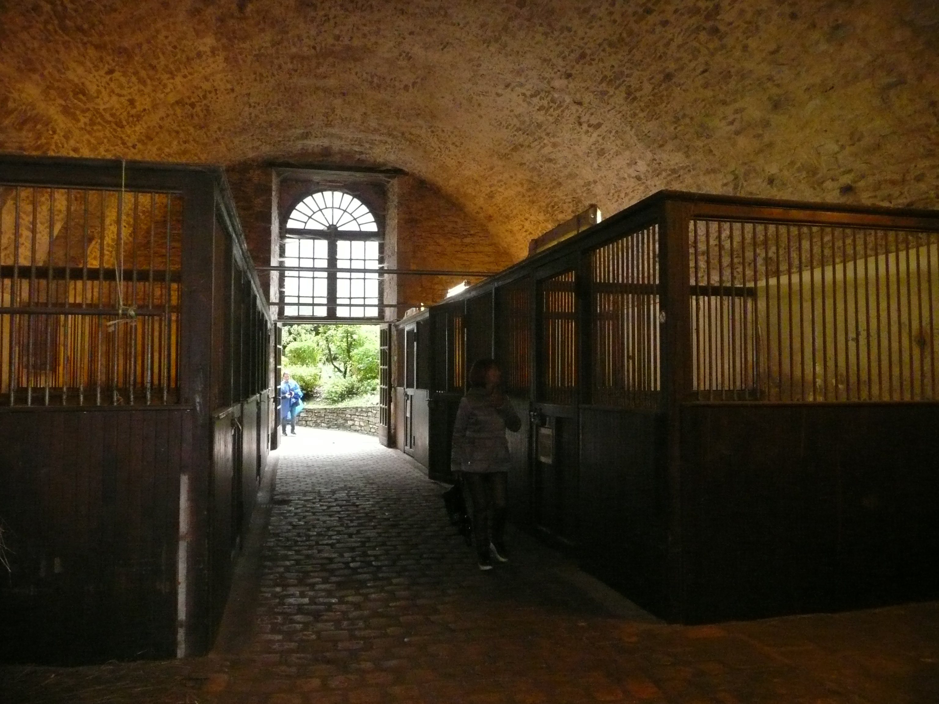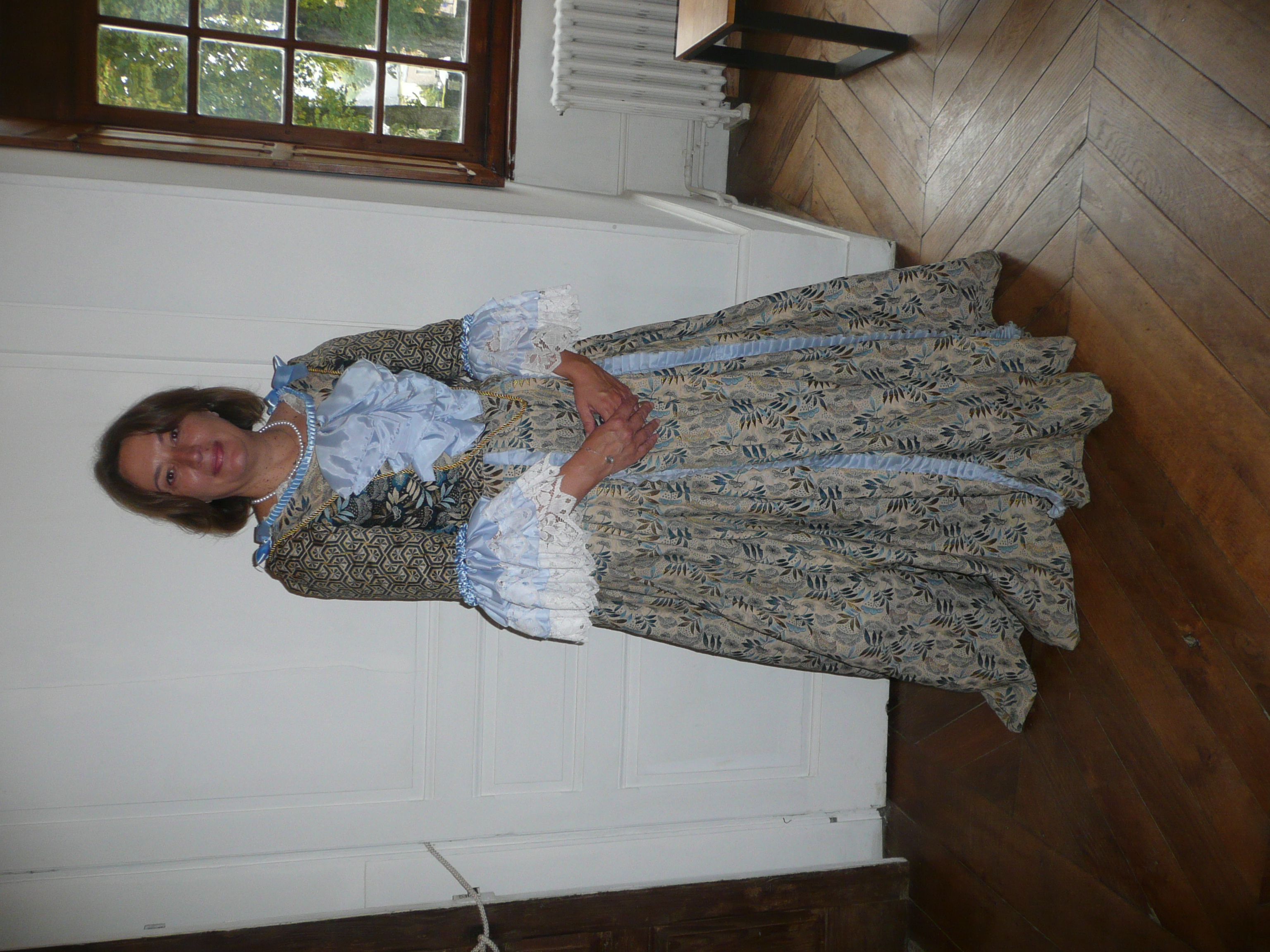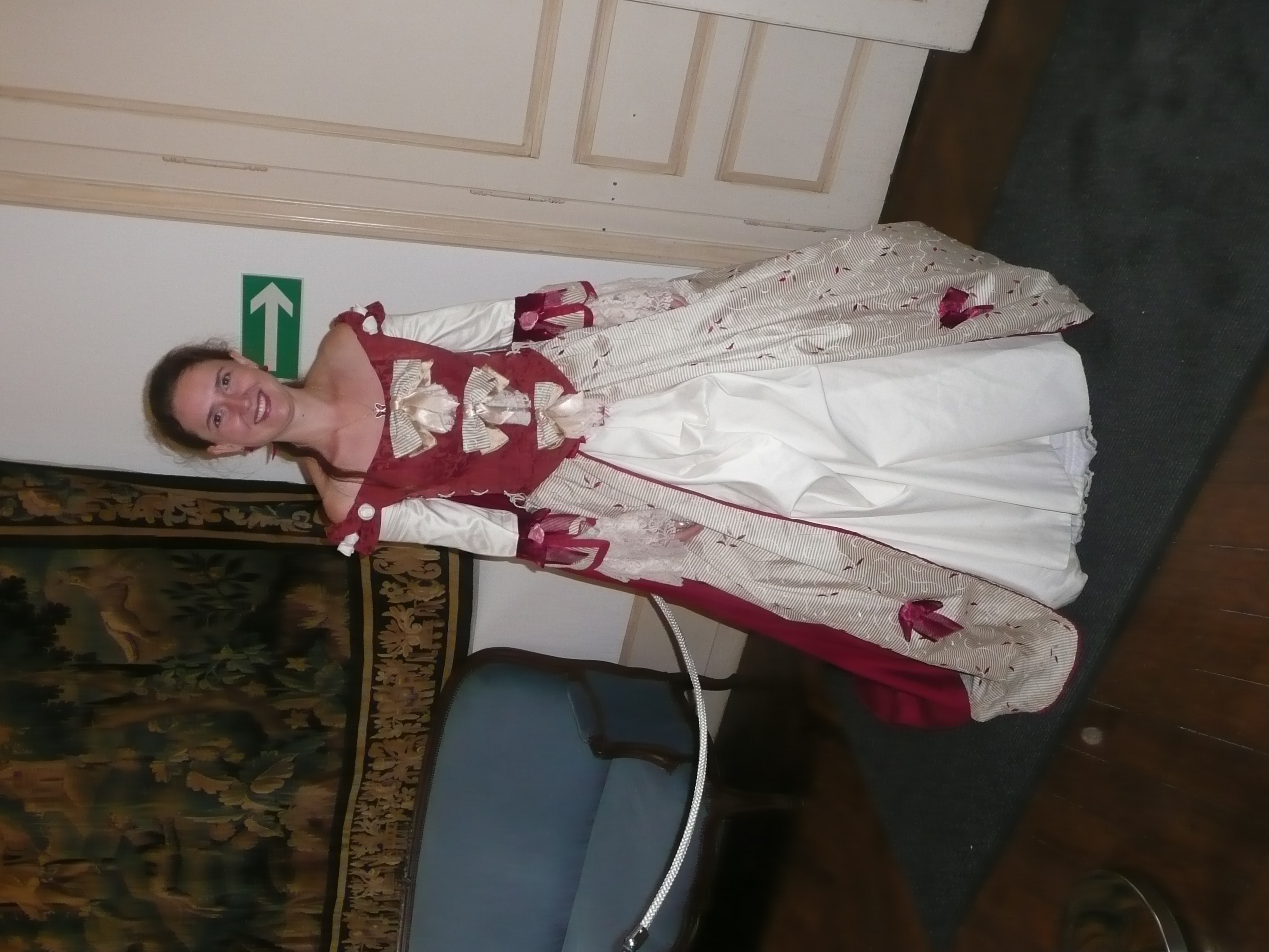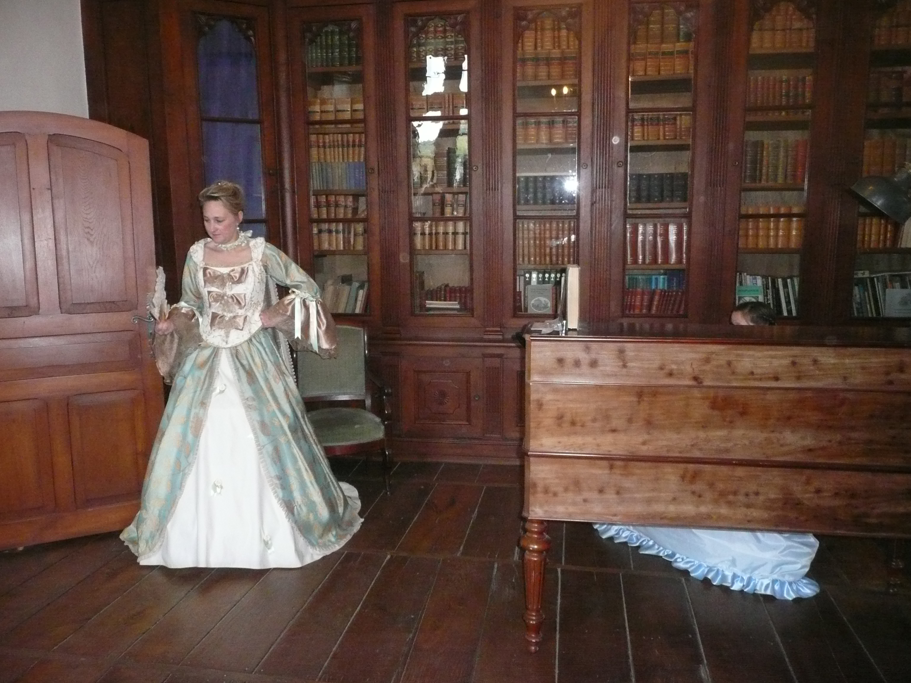 Visite du château, accueil par des dames en robe Louis XV.